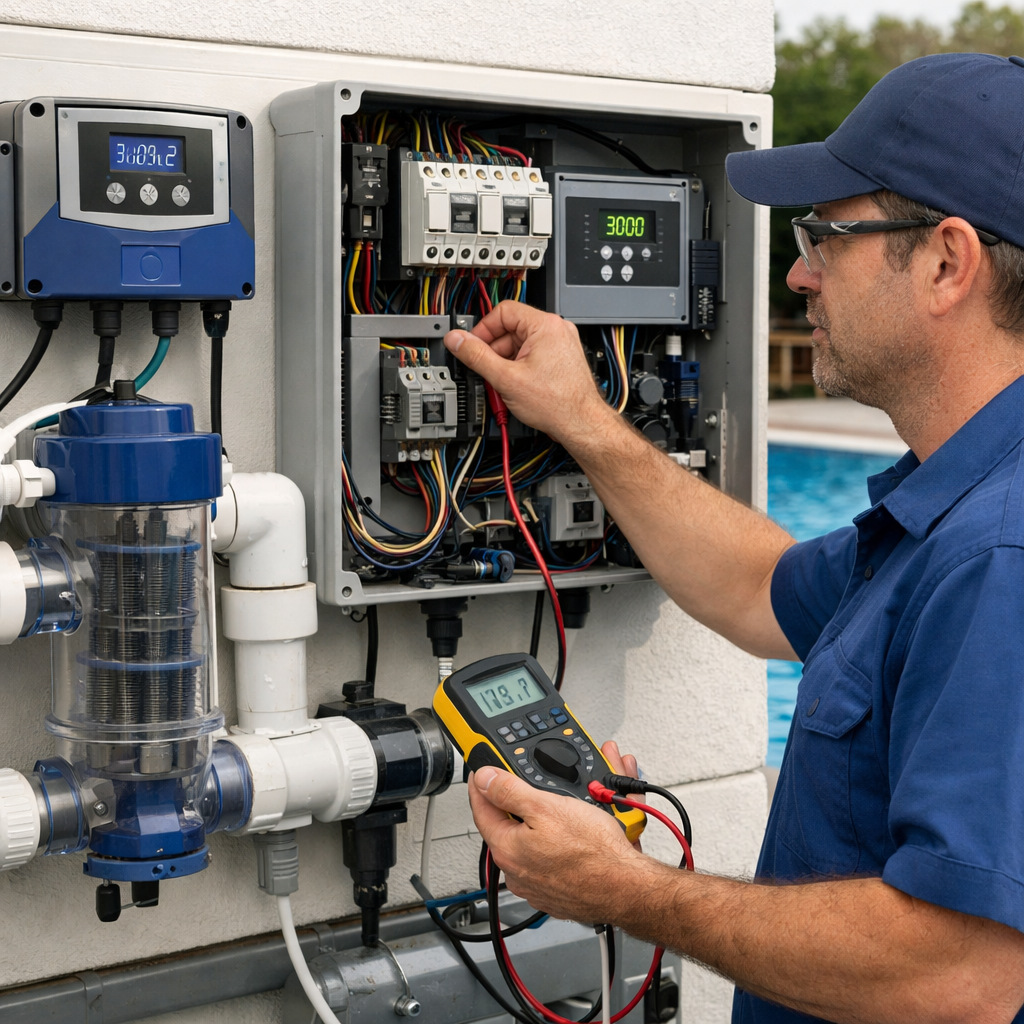 tratamiento del agua de piscinas. Aporta fundamentos de electrólisis, funcionamiento del equipo, ventajas e inconvenientes y conocimiento de sus componentes, así como el cálculo correcto según volumen, bañistas y tiempo de depuración.
